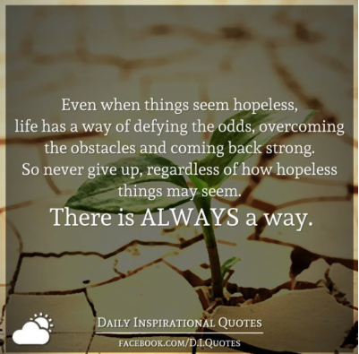 Even when things seem hopeless, life has a way of defying the odds, overcoming obstacles, and coming back strong. So never give up, regardless of how hopeless things may seem. There is ALWAYS a way.